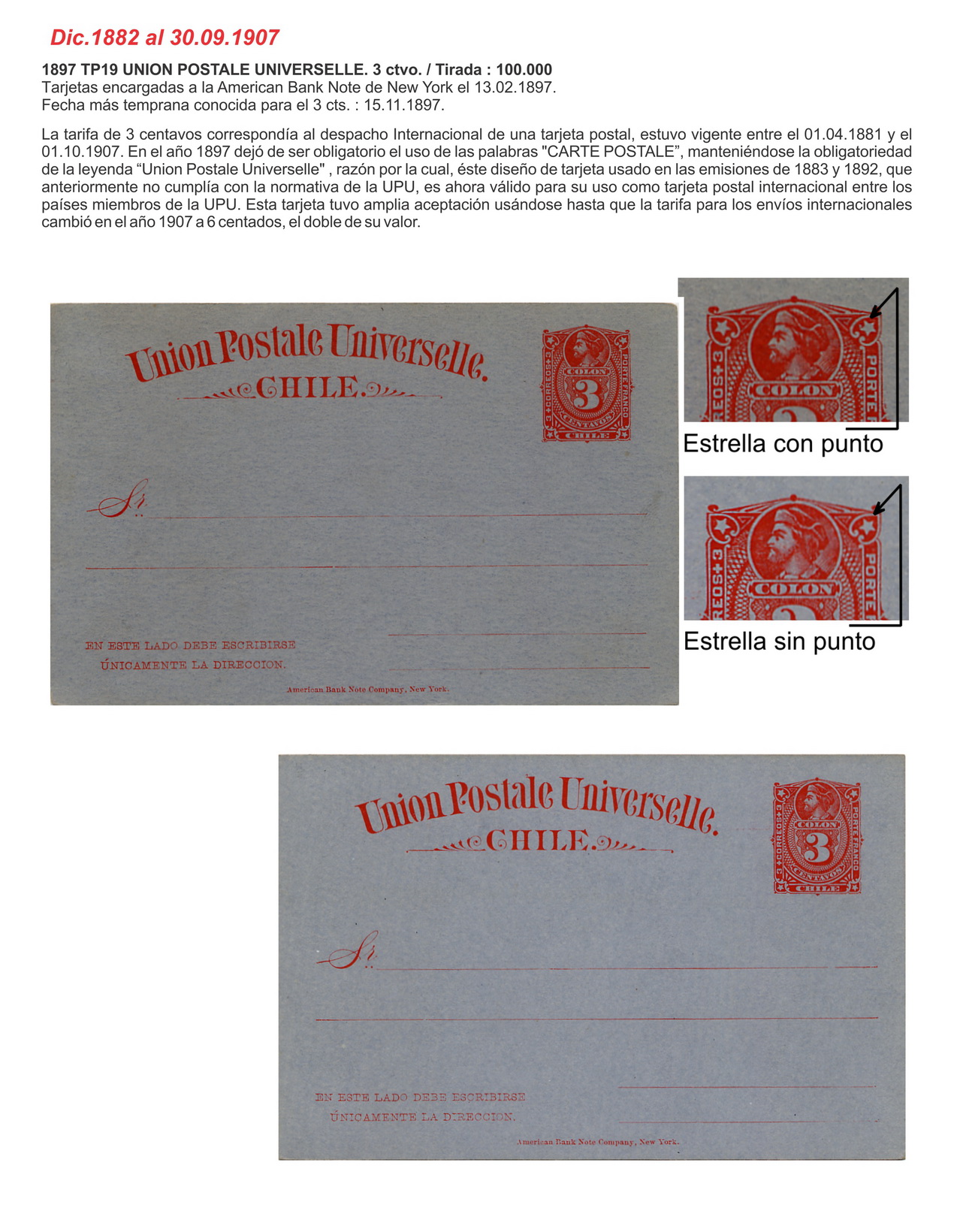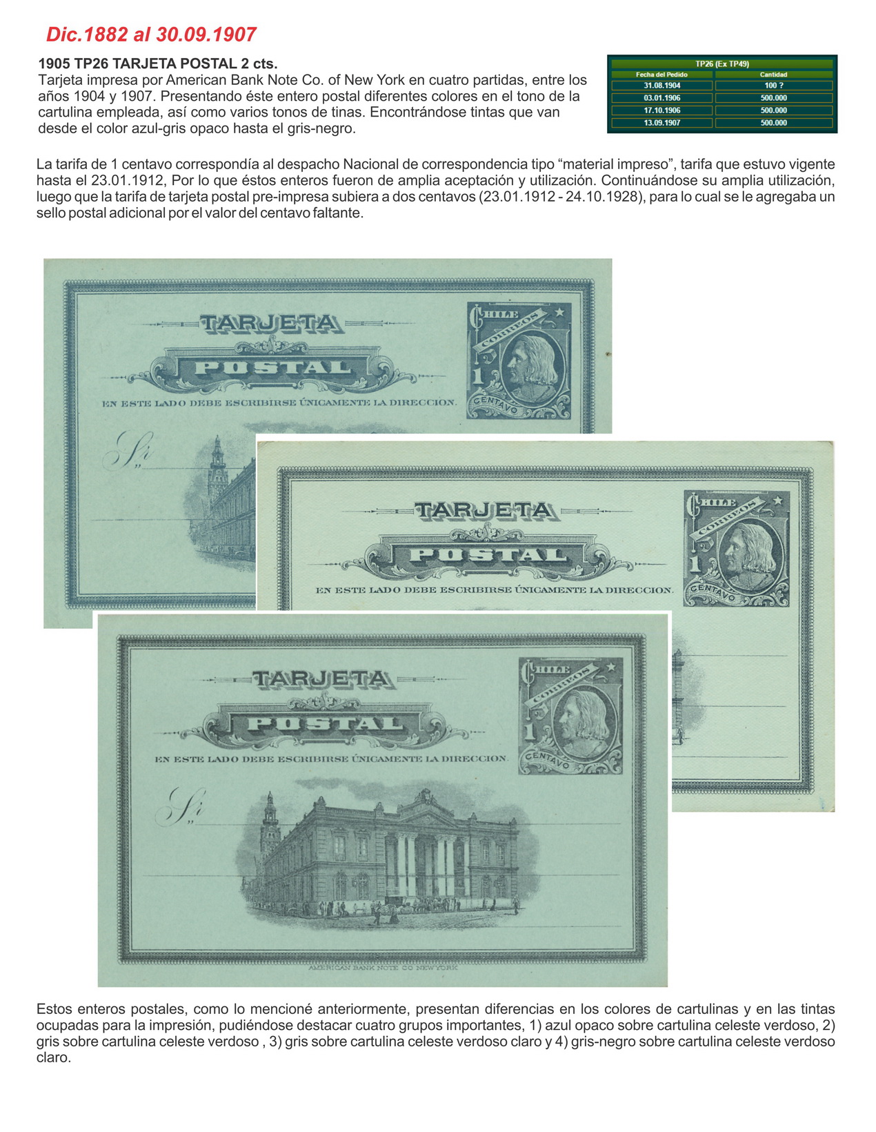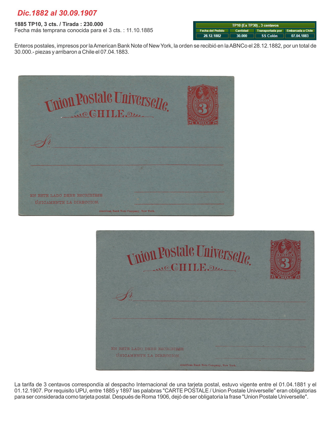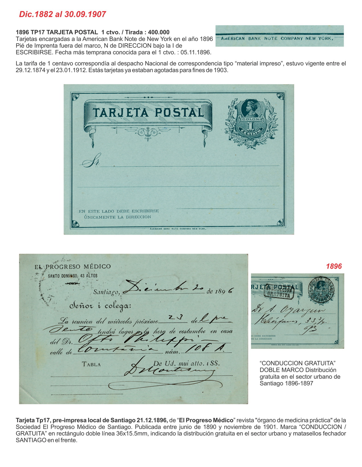 El período escogido abarca desde la aparición en diciembre de 1882 de la primera Tarjeta Entero Postal emitida por la Administración Postal específicamente para cumplir con la tarifa de un centavo, y que dejaba en mano de los particulares la obligación de imprimir en el reverso del mismo el texto y/o los diseños que ellos quisieran, siempre y cuando cumplieran con las exigencias que determinada la legislación postal, hasta el año 1920 en que dejó de ser válida la tarifa de 4 cts. para el despacho de una Tarjeta Entero Postal Internacional tipo “Material Impreso”. La última emisión de Tarjetas Enteros Postales fue en 1915.