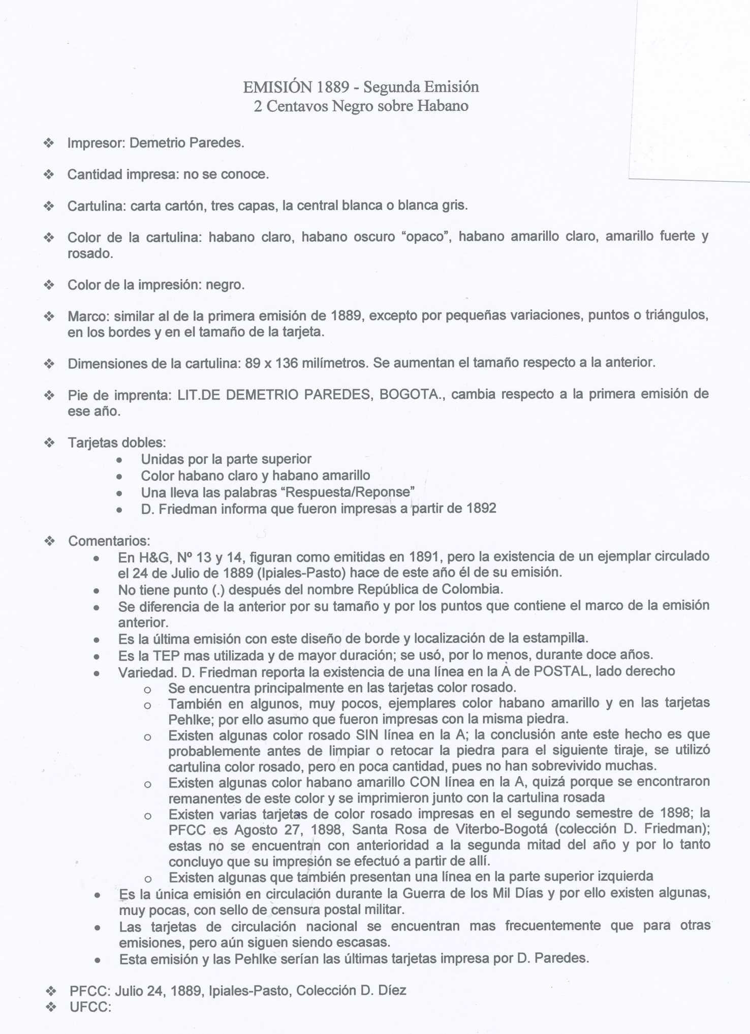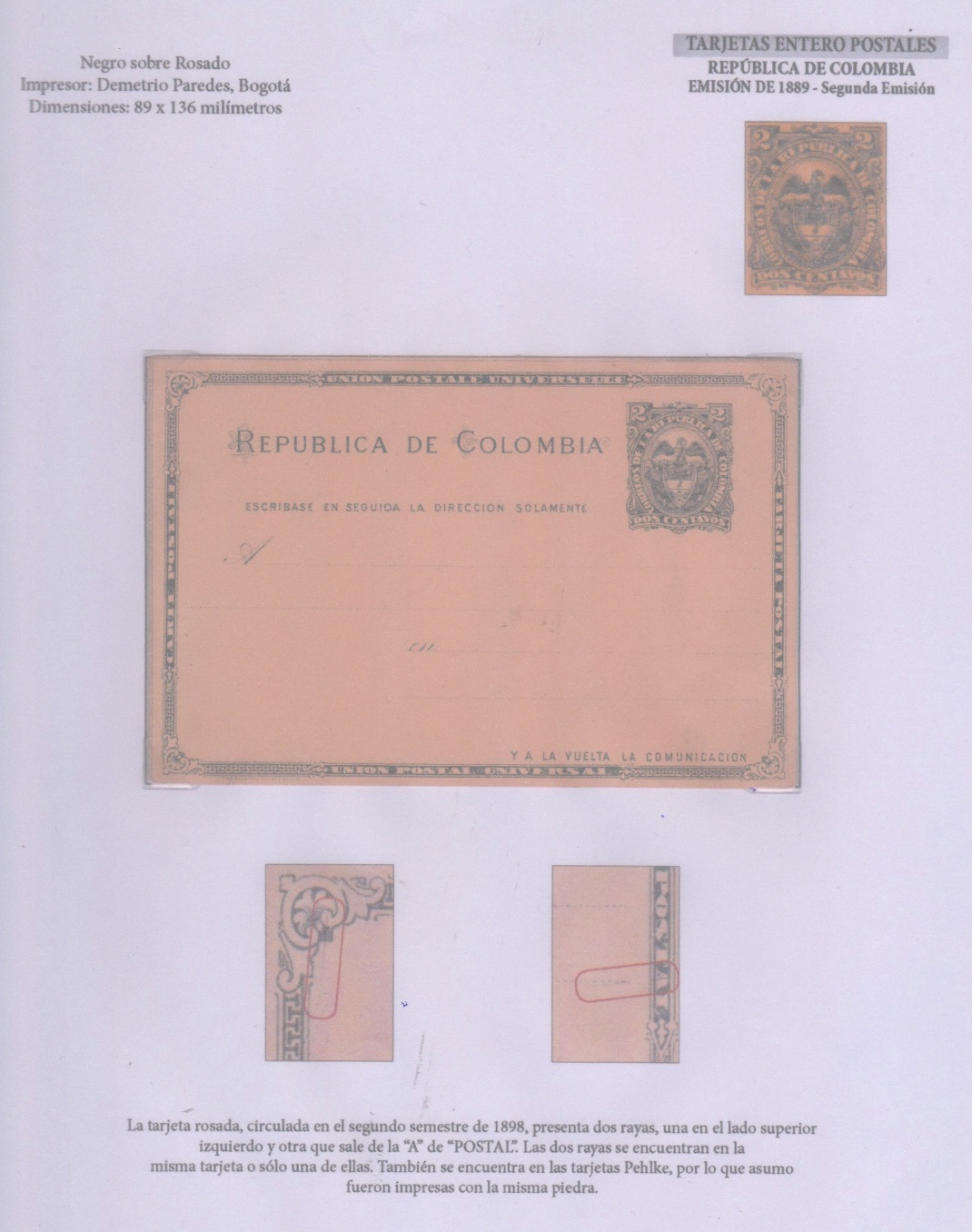 Existen dudas no solamente sobre la fecha de impresión de esta tarjeta sino sobre la razón de ser de su impresión, el catalogo que normalmente ha sido referencia en este tipo de cuestiones, el H&G indica que fue impreso el año 1.891, mientras que estudiosos en la materia como Darío Diez o D. Friedman que fue una segunda emisión hecha el año 1.889 porque existe una tarjeta circulado el 24 de julio de 1.889 entre Liales y Pasto, que actualmente se encuentra en la colección de Darío Diez.-