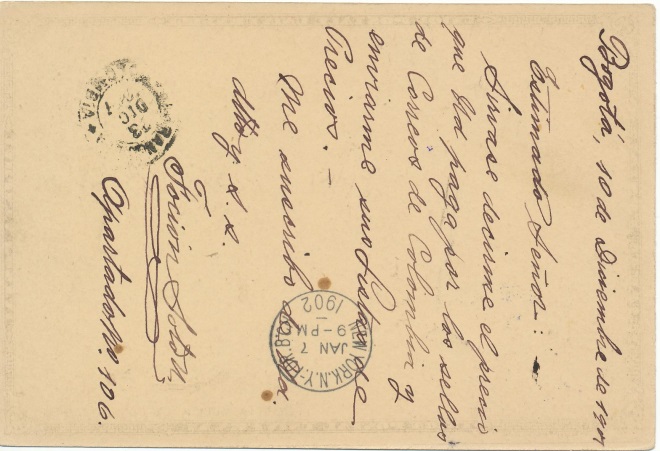 En el caso de que la tarjeta hubiese sido impresa en el año,1.891, el marco en el que nació seria parecido al anterior, y en el caso de que lo hubiese sido el año 1.901, será bajo la Presidencia de José Manuel Marroquín, quien ese año tenía que enfrentarse a las guerrillas revolucionarias que operaban con ayuda de Nicaragüenses Venezolanos y Ecuatorianos, en la zona Atlántica , con esta guerrilla consiguió acabar con la firma de varios tratados, el primero de los cuales se firmó el 24 de octubre de 1.902 en Neerlandia.-