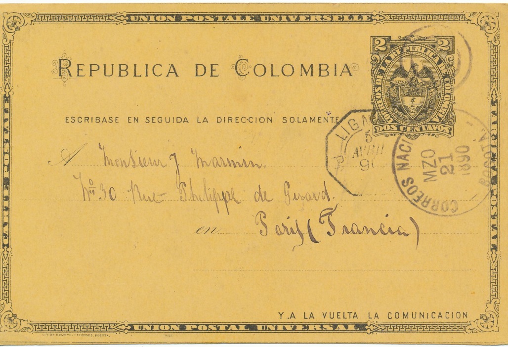 Tarjeta enviada a Paris (Francia) desde Bogotá el día 25 de Marzo de 1.890, con matasellos de llegada del mes de abril.-