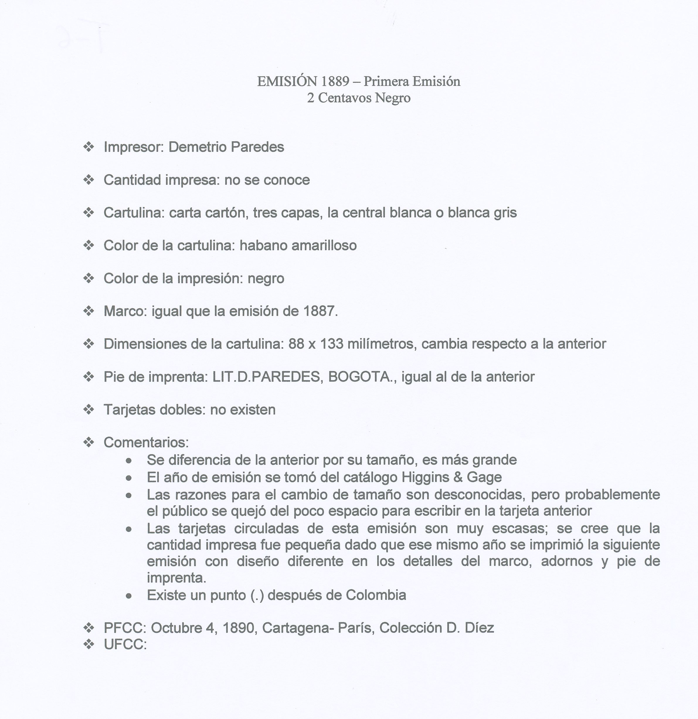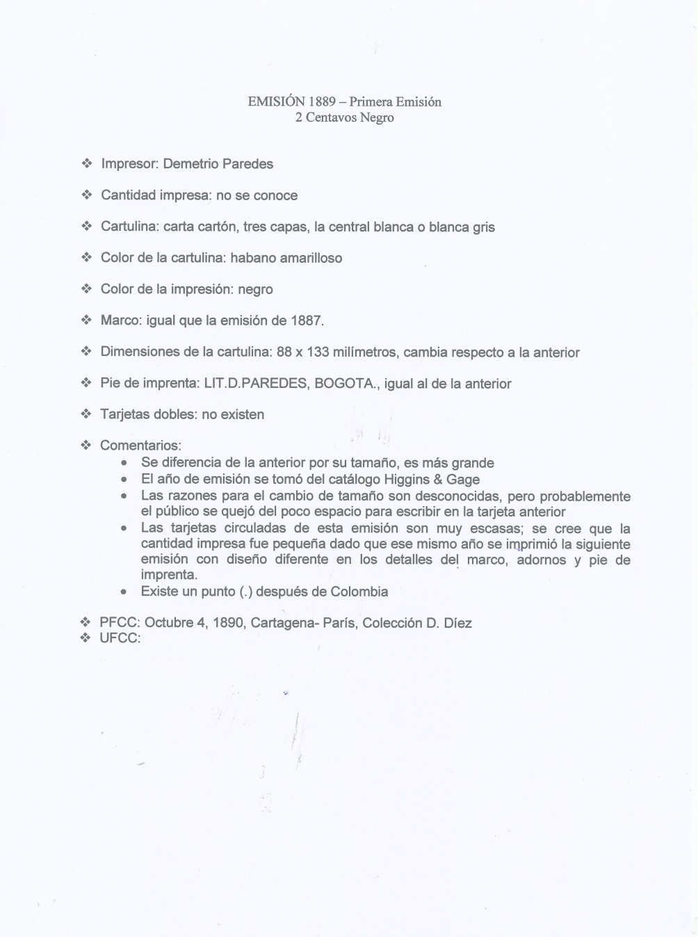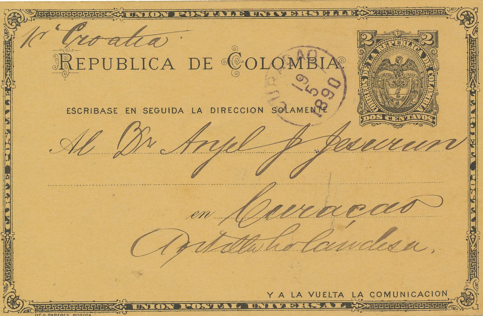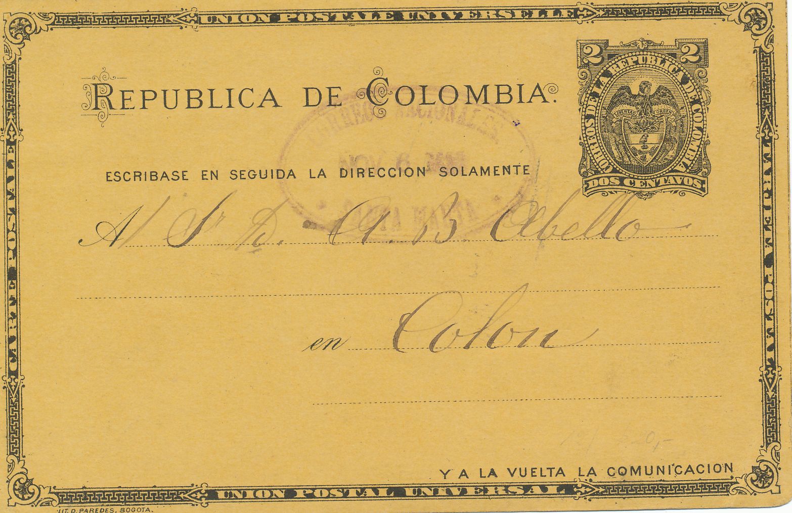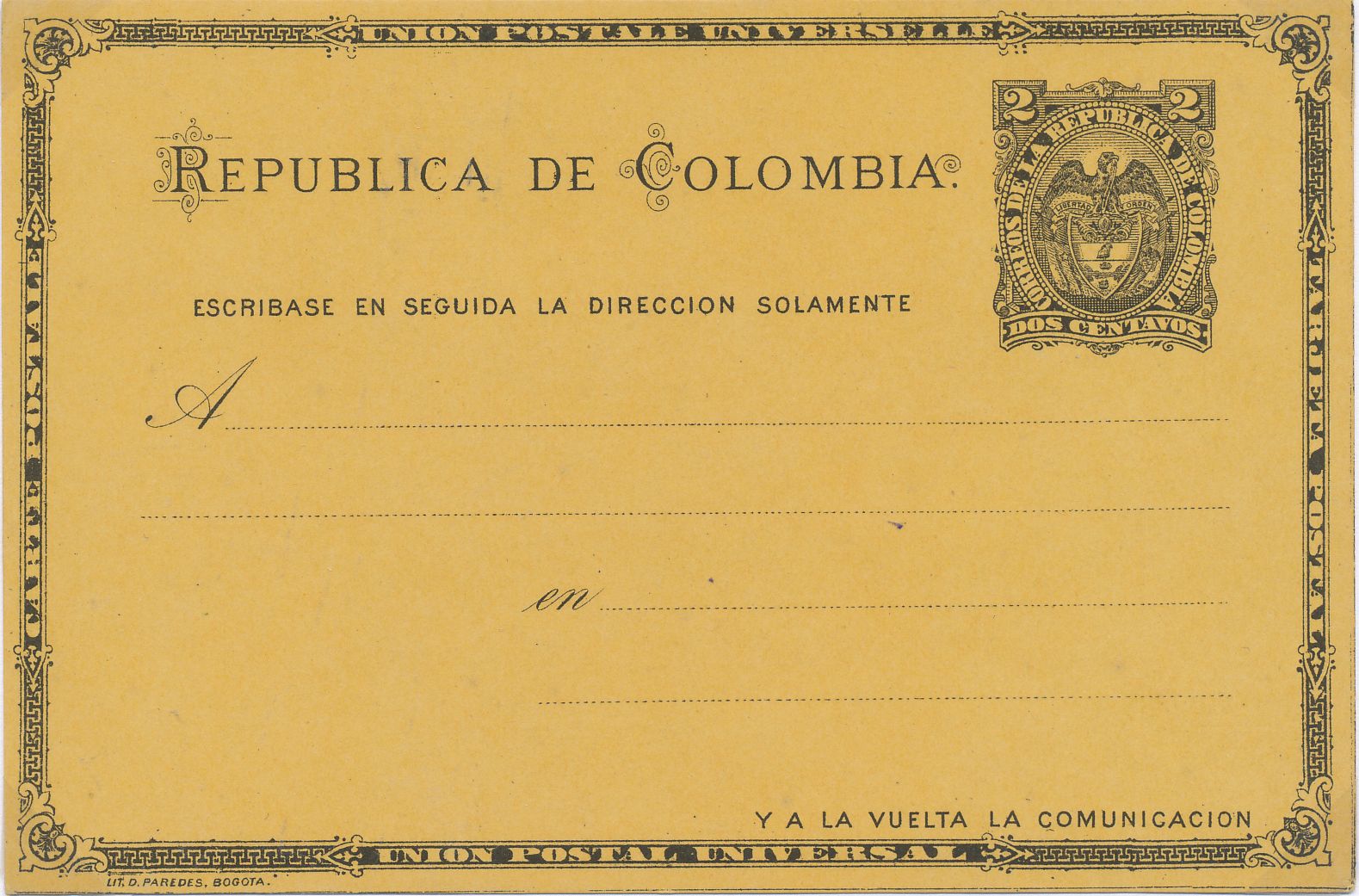 La tarjeta fue impresa siendo Presidente Carlos Holguín Mallarin, dos años después de que se hubiese proclamado una nueva constitución, el periodo de gobierno del Sr. Holguín, fue muy positivo, aunque con muy escasos medios, mejoró las carreteras y la navegación por el bajo Cauca, la fotografía llegó a Colombia bajo la mano del impresor Demetrio Paredes, y se empezó a publicar el periódico “El espectador” cuyo primer director fue Fidel Cano, este periódico ha llegado hasta la actualidad.-