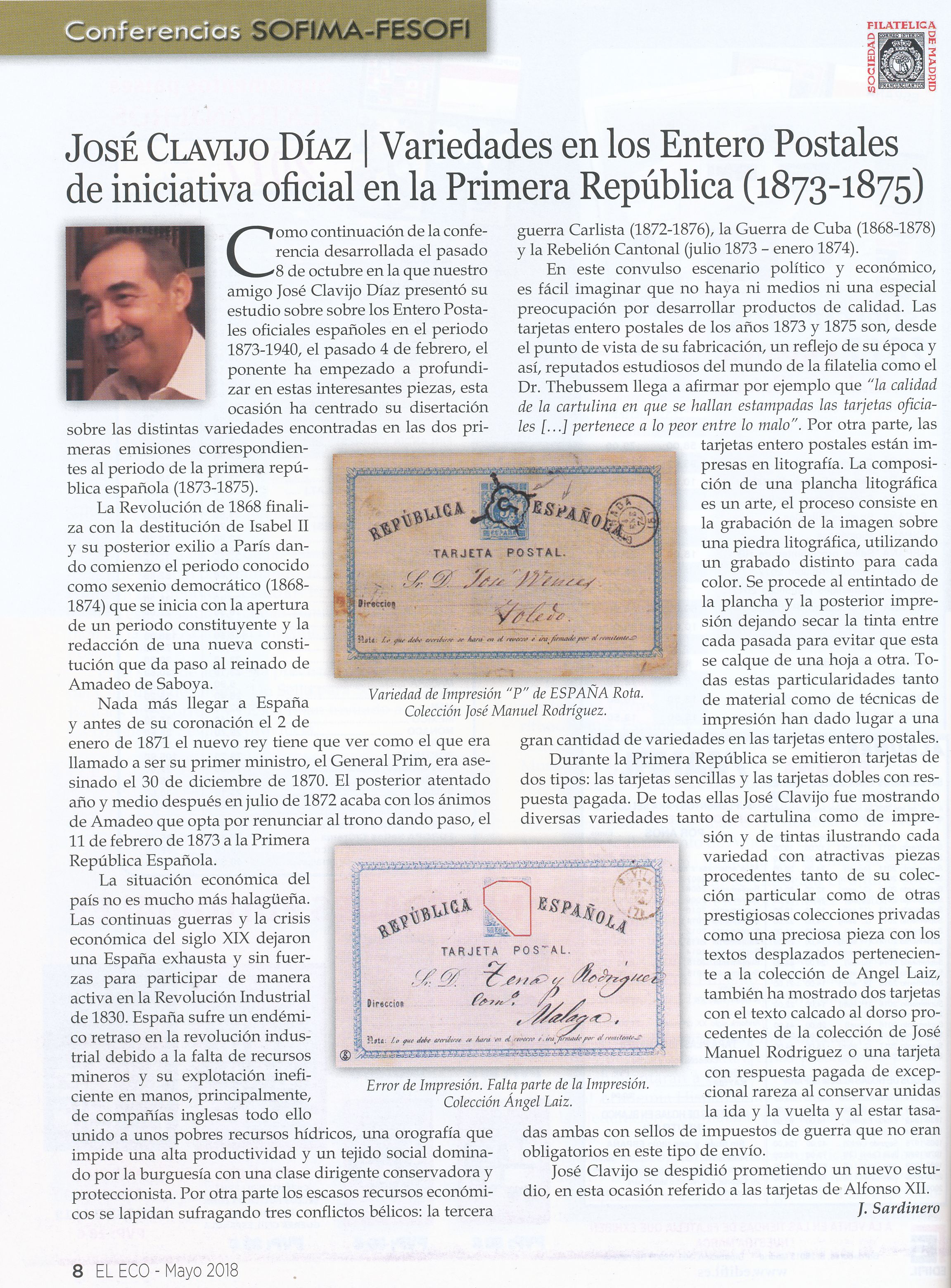 El día 4 de febrero José Clavijo dio una muy interesante conferencia sobre variedades de los enteros postales de iniciativa oficial en la Primera República Española.-