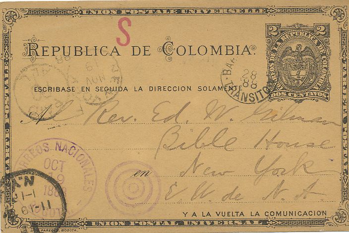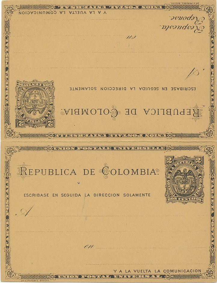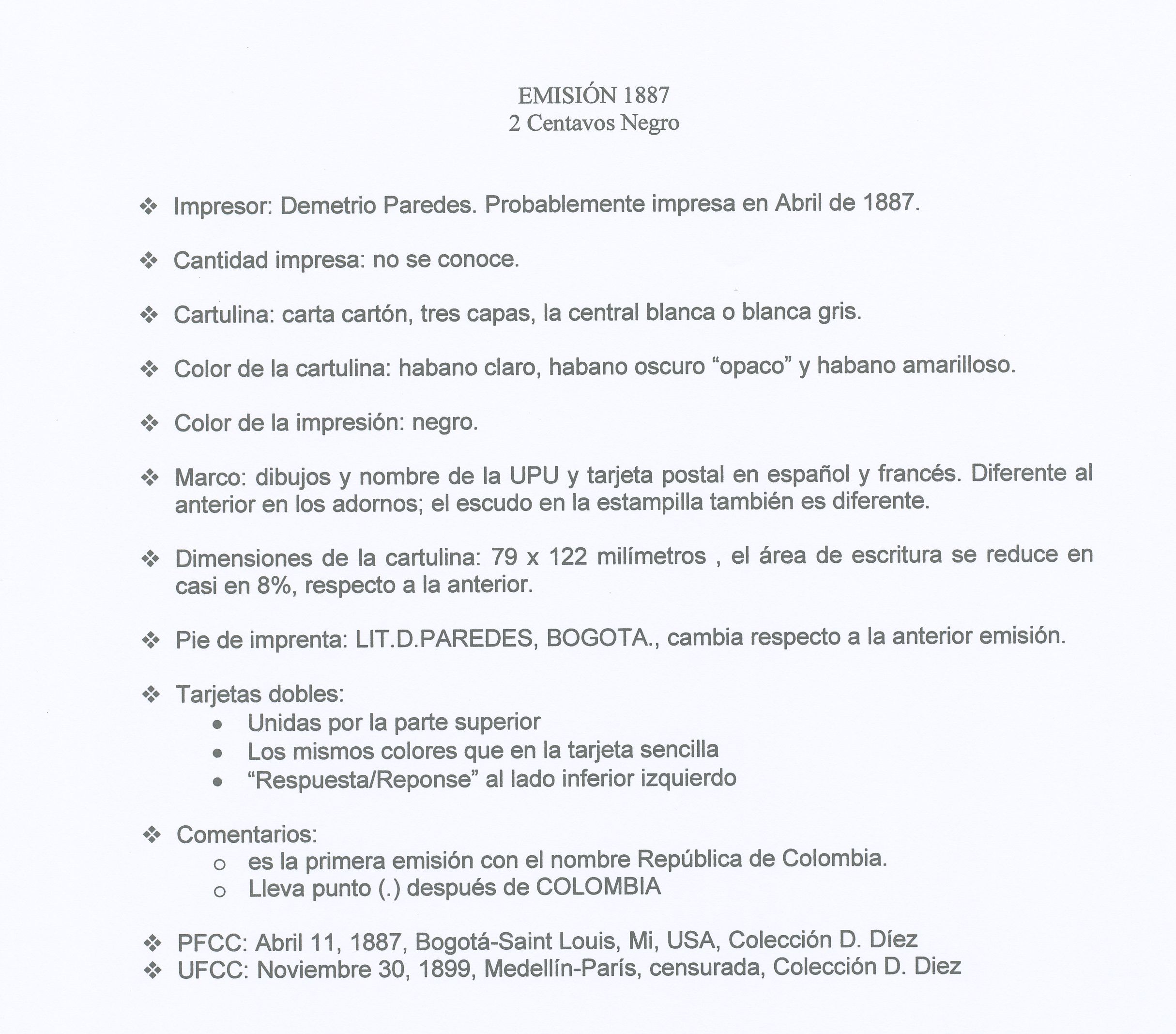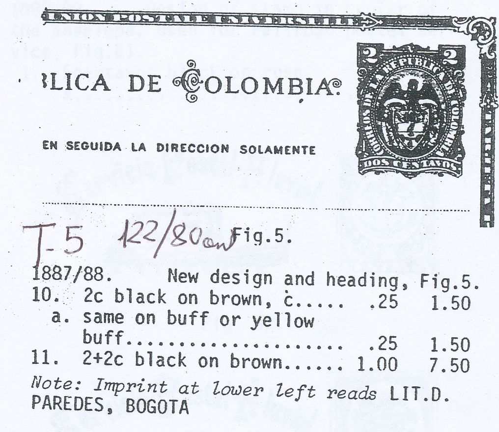 El año 1.887 se imprimió la quinta serie de tarjetas colombianas se hizo, como en ocasiones anteriores en la imprenta de Demetrio Paredes en Bogotá, fue durante el tercer mandato de Rafael Núñez (llegaría a ostentar la Presidencia de la Nación por cuatro veces), un año más tarde se cambiaría la constitución.-