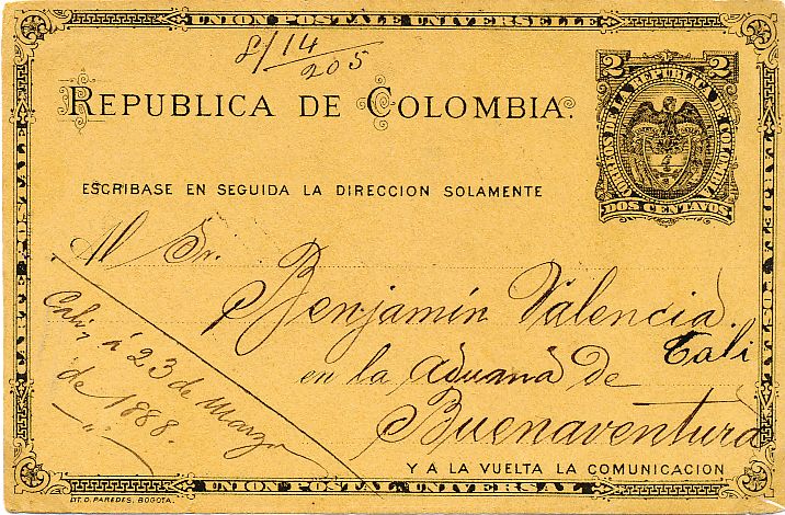 Entero circulado desde Cali a Manizales el 23 de marzo de 1.888.-