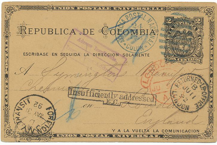 Y en otros casos de “devuelto” como en este caso cuyo envío a Londres, fue devuelto por franqueo “insuficiente”.-