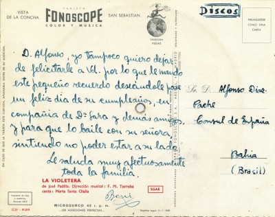 La que me guardo Silvia tenía nada más ni nada menos, como destino San Salvador de Bahía en Brasil e iba dirigida a D. Alfonso Díaz Poche, a la sazón, cónsul de España en esa localidad.-
