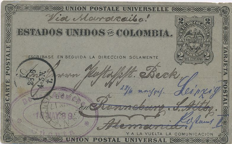 Tarjeta enviada desde Cucuta, vía Curaçao (7 de junio), N.Y. (17 de junio) a Leipzig donde llego el 28 de junio de 1.889.-
