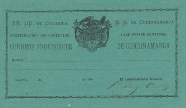 Se conoce solo un valor (20 centavos) impreso en papel verde firmado (con sello de tinta) por el Administrador General de Correos del Estado soberano de Cundinamarca. Sus dimensiones son 110 mm (horizontal) y 55 mm vertical, cortadas con márgenes hasta de 10 mm por cada lado.
