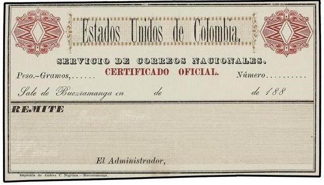 En Bucaramanga fueron impresos dos Certificados Oficiales en los ultimos años de la denominación de Estados Unidos de Colombia (1880-1886) y cuatro modelos de Certificados Oficiales impresos con la denominacion Republica de Colombia (1887-1892 fechas de ejemplares usados). La curiosidad es que los diseños y tamaños y diagramación utilizados para estos certificados oficiales impresos en la tipografía de Andres Nigrinis y en la Tipografía Mercantíl de Bucaramanga, son los mismos diseños y tamaños y diagramación de las Cubiertas de Valor Declarado nacionales y del Tolima.