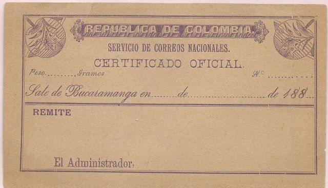 Los certificados oficiales (otro tipo de entero postal colombiano) fueron impresos con autorizacion de las oficinas locales de correos nacionales pero no aparece impresa ninguna tarifa a pagar o valor impreso que se pagaba por el uso de los certiificados oficiales. Fueron utilizados para enviar estampillas nacionales y de timbre, tarjetas e impresos postales, documentos contables entre oficinas postales y documentaciones de todo tipo entre oficinas del gobierno, tribunales y juzgados.