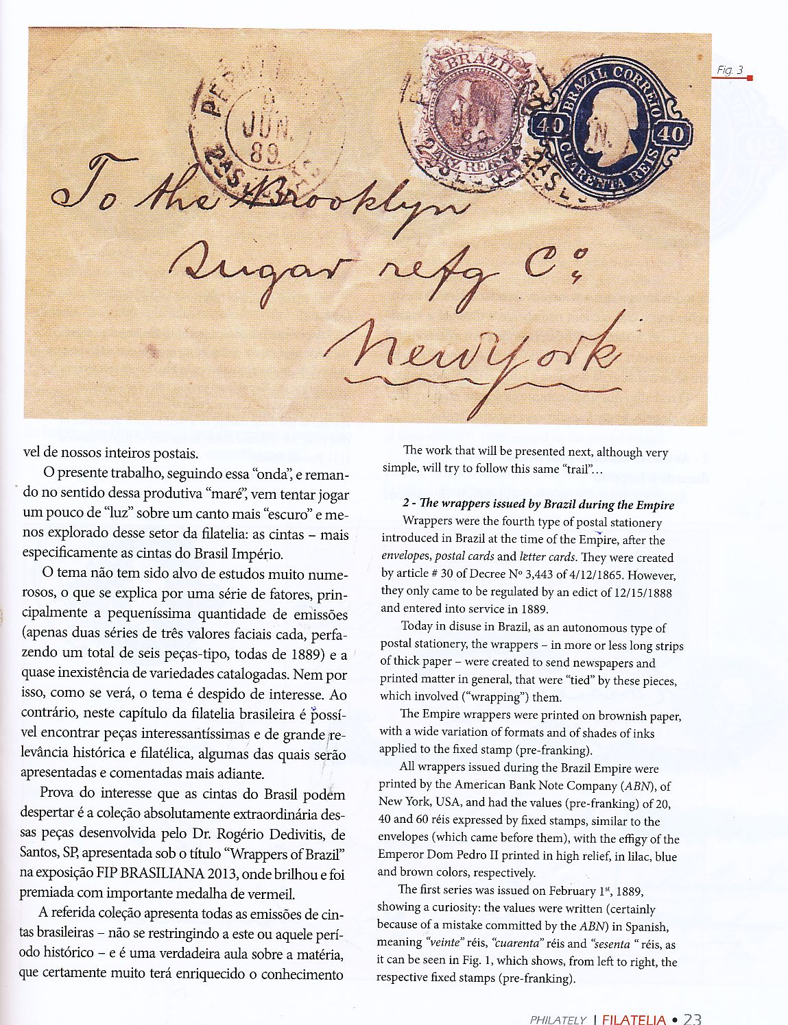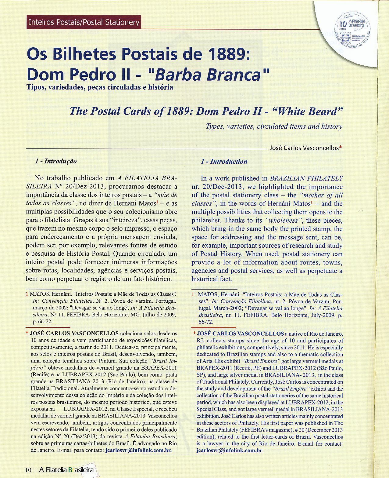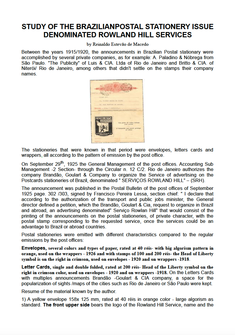Otra figura importante dentro de los enteros postales americanos es José Carlos Vasconcellos, en la Revista Filatelia de la Federación Brasileña de Asociación Filatelicas, escribe este interesantísimo artículo sobre los enteros Brasileños del Imperio.-